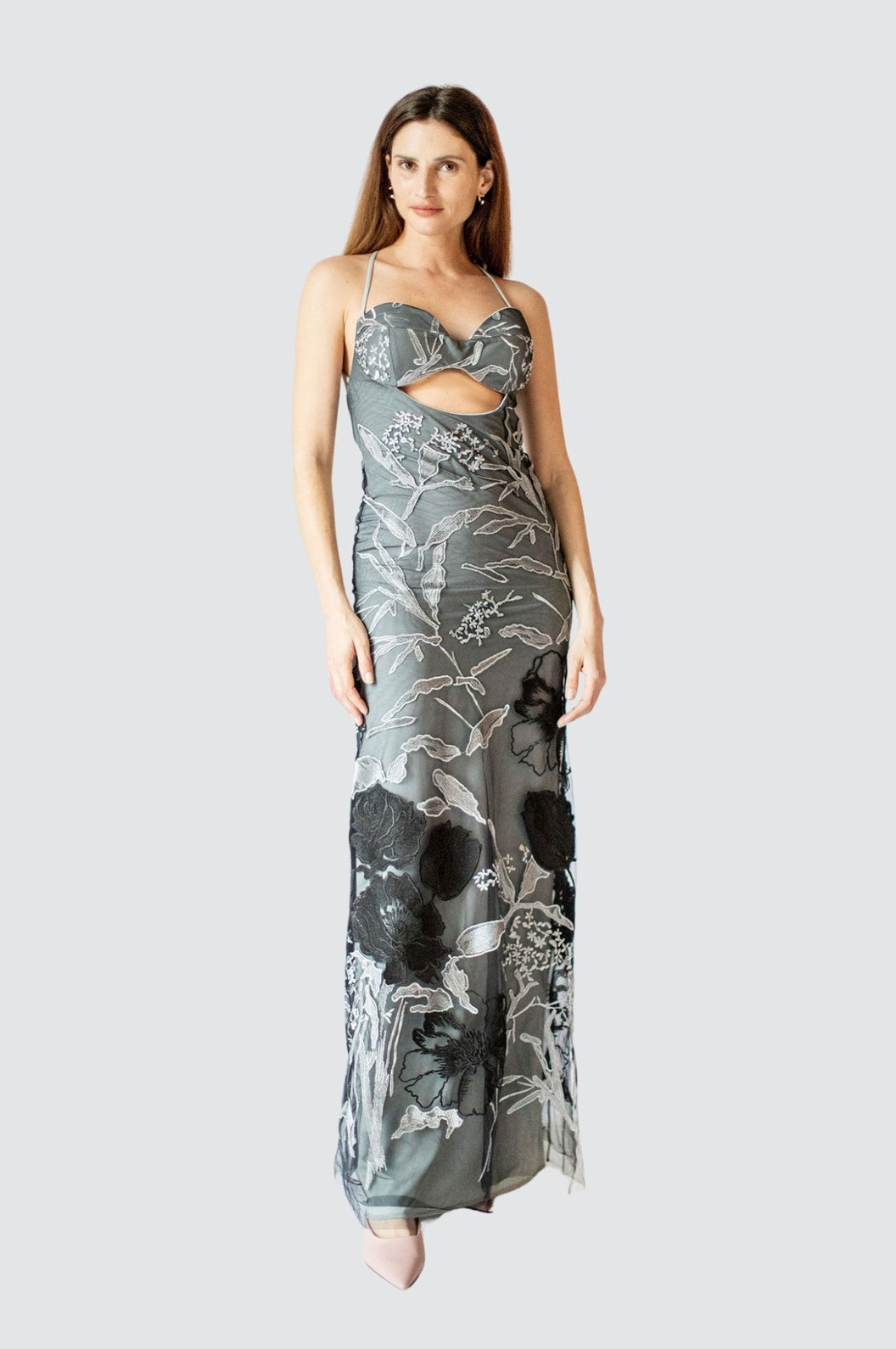 Cut-Out Embroidery Grey Tulle Gown