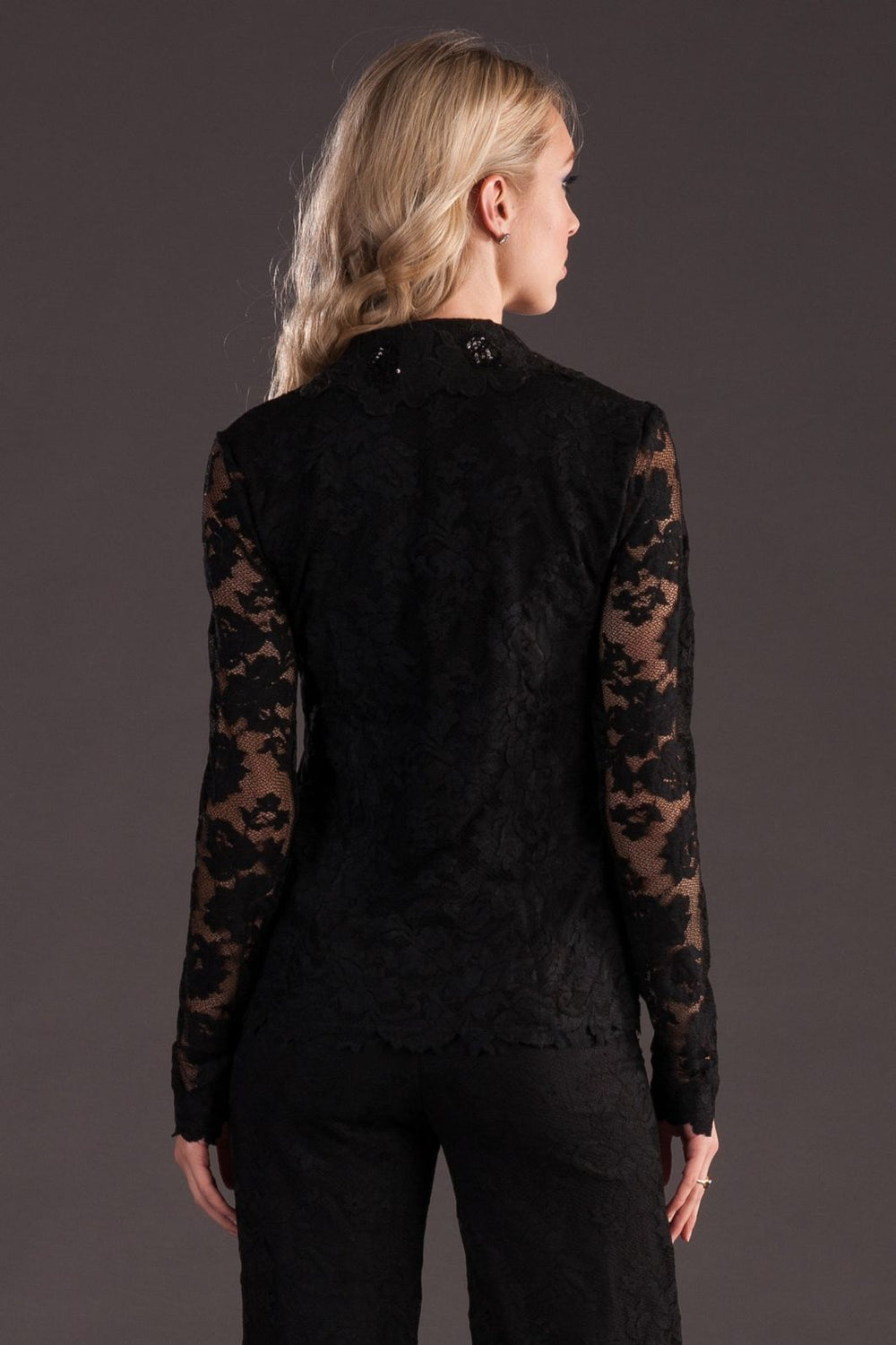 Turn heads with this exquisitely crafted black lace cardigan, designed for the modern woman who embraces timeless sophistication. Featuring a deep plunging neckline and intricate floral lace throughout, this piece is adorned with delicate trimming applications along the front, adding a subtle sparkle and dimension. The sheer long sleeves and scalloped edges bring a touch of romance, while the tailored silhouette ensures a flattering fit. Perfect for evening events, upscale dinners, or as a statement layer over formal wear. Pair it with tailored pants or a sleek skirt for a look that’s both bold and refined.
