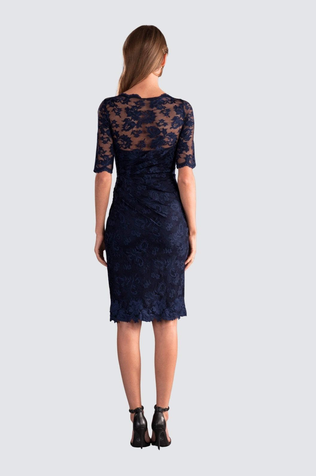 This handmade dress features intricate lace detailing and a flattering silhouette that is perfect for any cocktail event.
