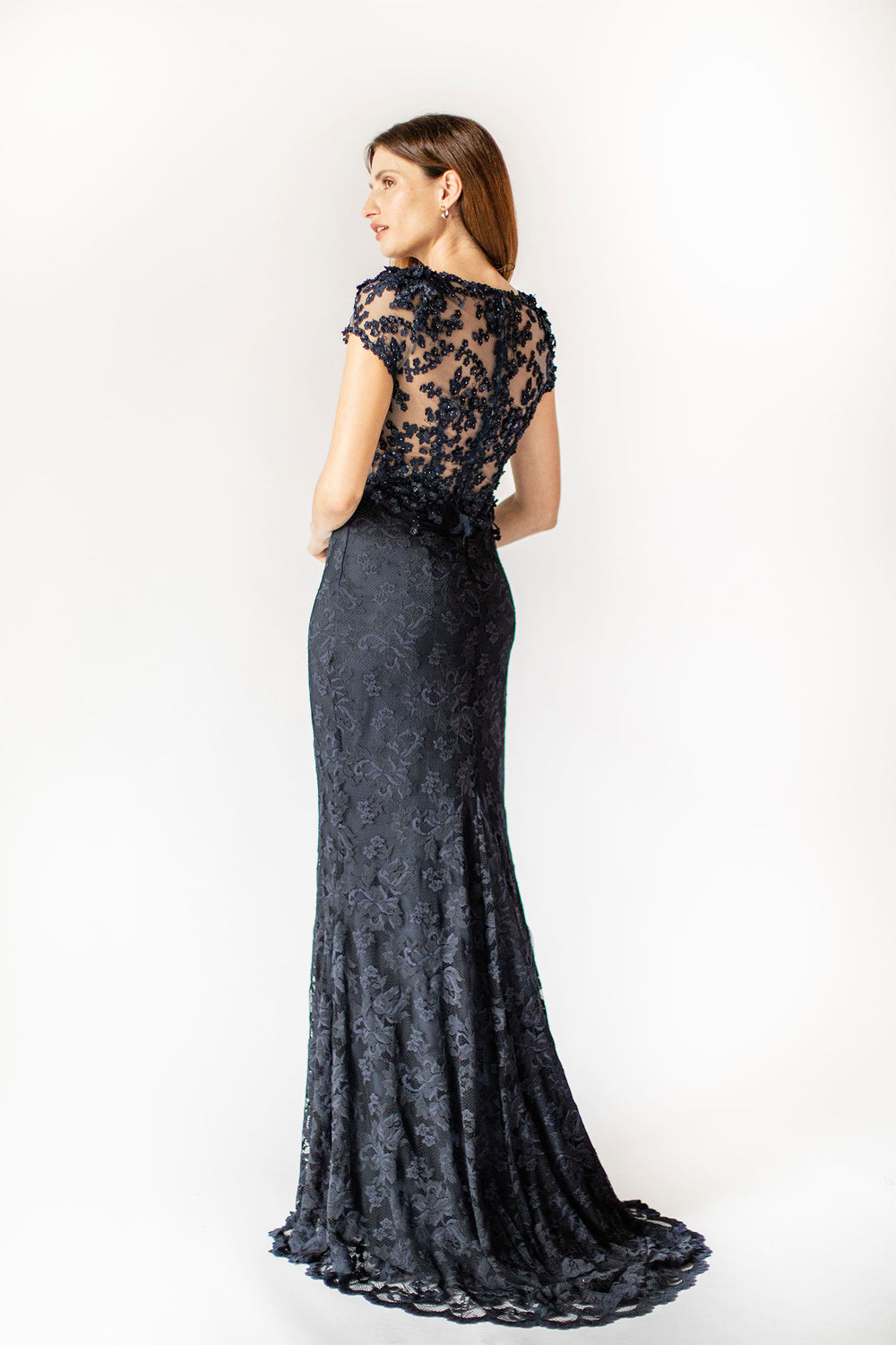 Experience celestial allure in our Celestial Mermaid Elegance Gown, a longer version of our enchanting lace dress that combines timeless sophistication with modern detailing. This gown features a mesmerizing mermaid silhouette, a daring slit, and special applications in the upper part, complemented by sheer tulle in the back.