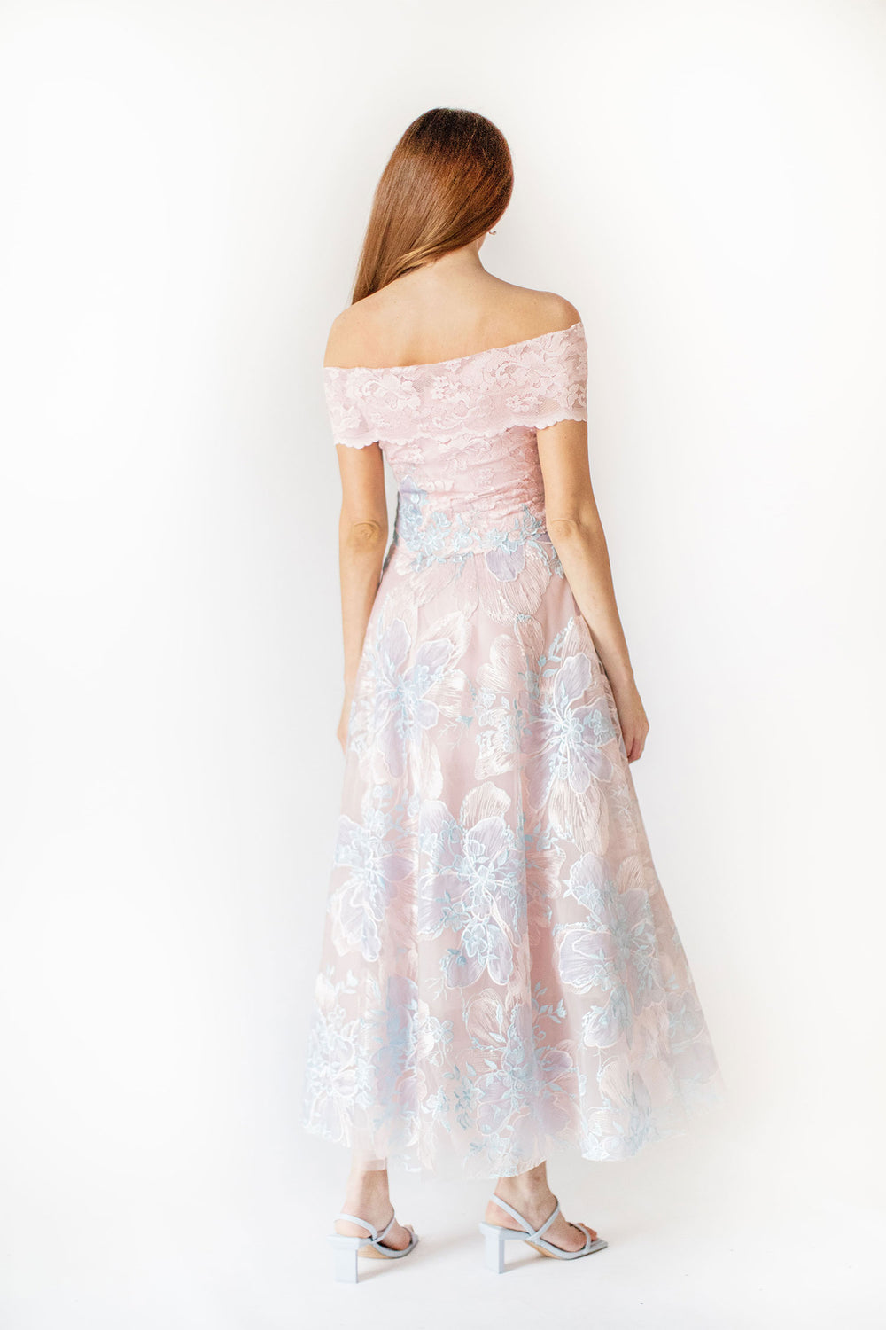 Get ready to twirl in this sweet as cotton candy off-shoulder dress.
