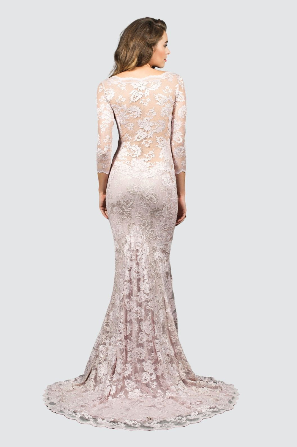 Make a statement of timeless elegance with this exquisite blush pink evening gown. Crafted with delicate lace, this dress features a figure-hugging silhouette, 3/4-length sleeves, and a sophisticated V-neckline.