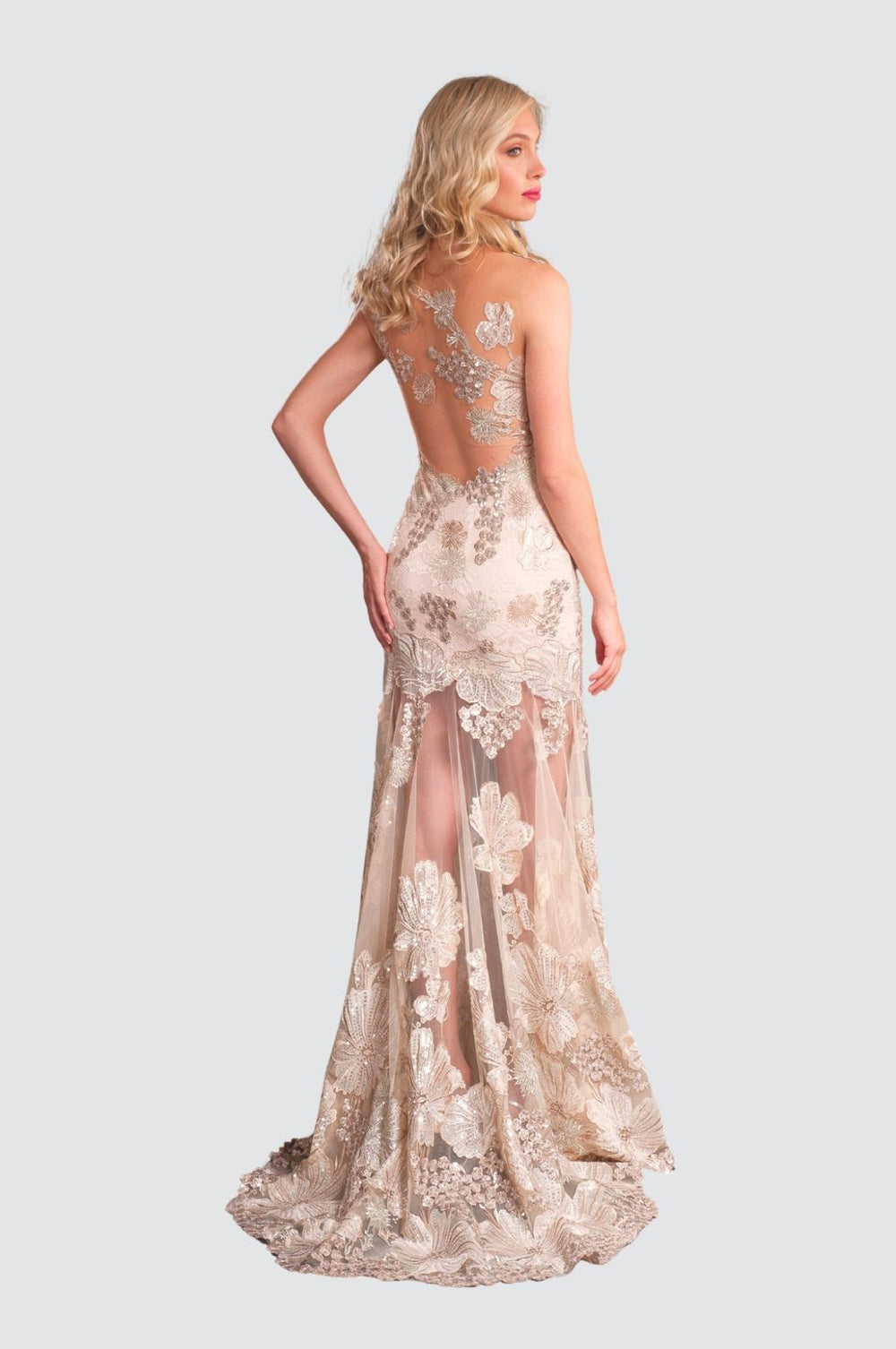 Turn heads in this show-stopping nude lace gown, style OY9334. Featuring a plunging illusion neckline and intricate floral embroidery with delicate sequin accents, this dress blends sophistication with sensual elegance. The fitted bodice transitions into a sheer, floor-length skirt adorned with ornate lace appliqué, creating an ethereal and graceful silhouette. Perfect for formal occasions, red carpet events, or black-tie galas, this gown offers timeless allure with a modern twist.