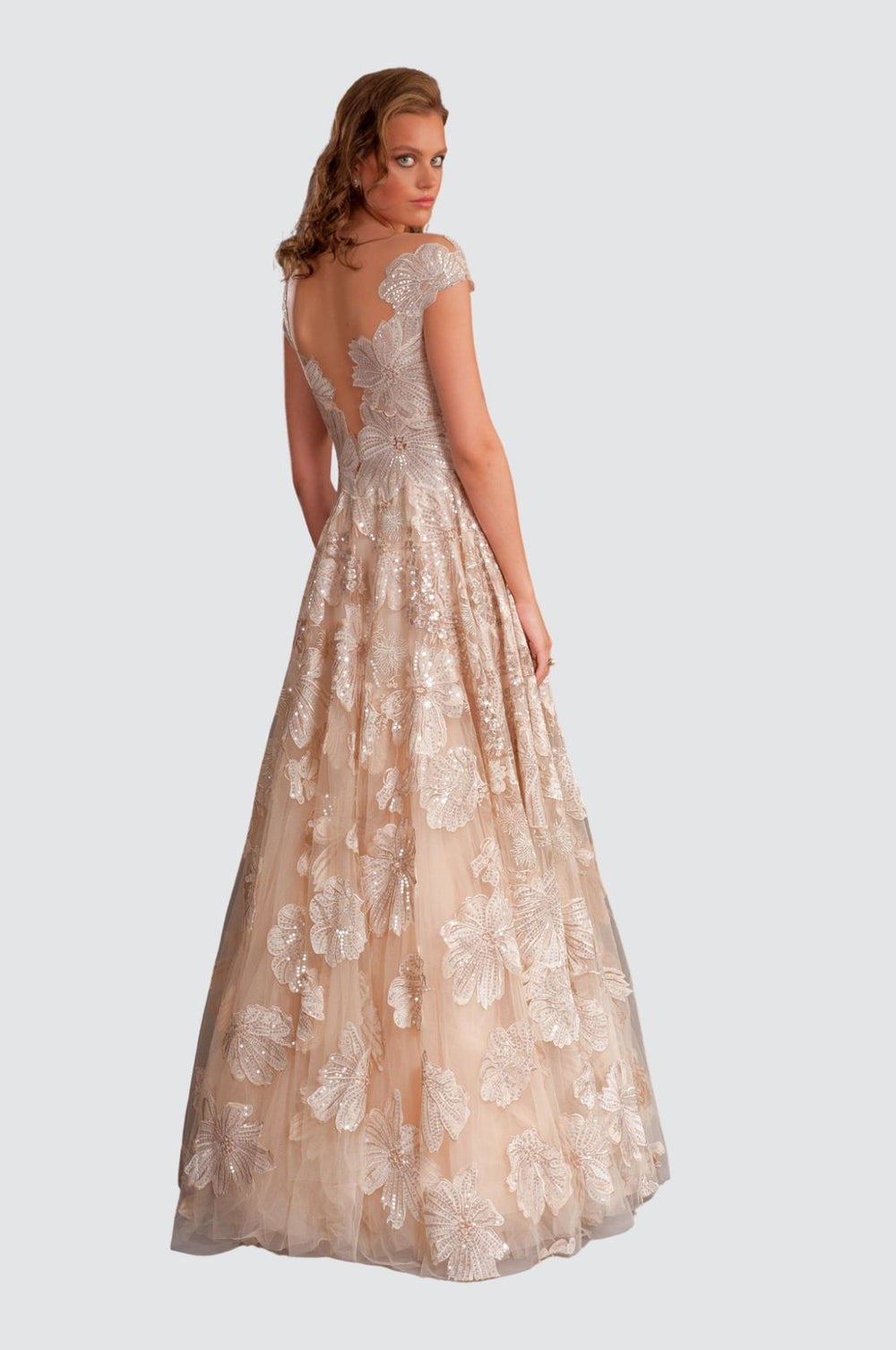 Make an unforgettable entrance in this breathtaking couture gown, crafted from layers of delicate nude tulle and embellished with intricate 3D floral embroidery. The OY9332 dress features a romantic A-line silhouette, a plunging illusion neckline with floral scallop detailing, and soft cap sleeves for a timelessly feminine touch. Fully lined for comfort, the gown flows effortlessly to the floor with a graceful sweep train. Perfect for weddings, red carpet moments, or high-end evening affairs, this piece is a celebration of elegance and craftsmanship.
