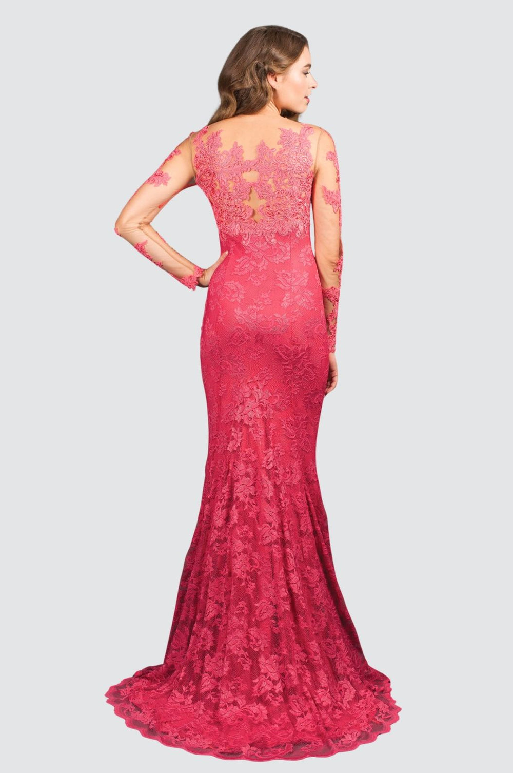 Make a statement with this breathtaking long-sleeve lace gown in a vibrant rose hue. Featuring intricate floral lace detailing from top to hem, this full-length dress combines elegance and drama. The fitted bodice and mermaid silhouette flatter the figure, while the sheer lace sleeves add a romantic touch.