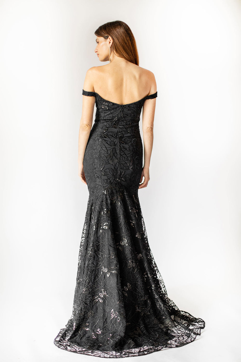 Elevate your enchanting presence with our Noir Petal Off-Shoulder Mermaid Gown—a captivating silhouette that marries the allure of a mermaid design with the delicate beauty of off-shoulder elegance and black floral leaves. This gown is a celebration of nature-inspired grace, ensuring you make a stunning statement at any special occasion.