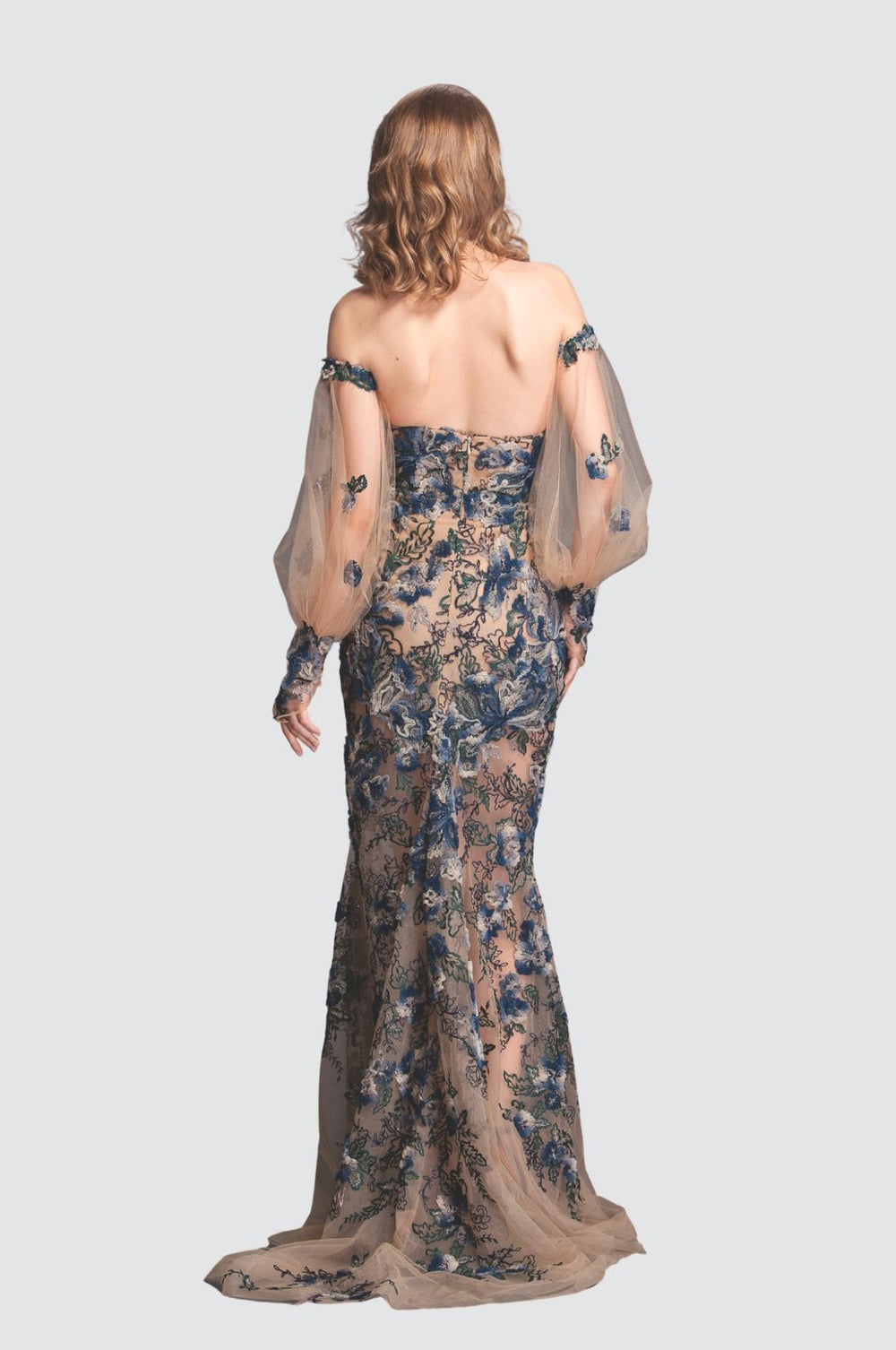 Featuring an off-shoulder design, detachable puff sleeves, and a fitted bodice adorned with delicate floral patterns, this floor-length dress flows into a graceful train.