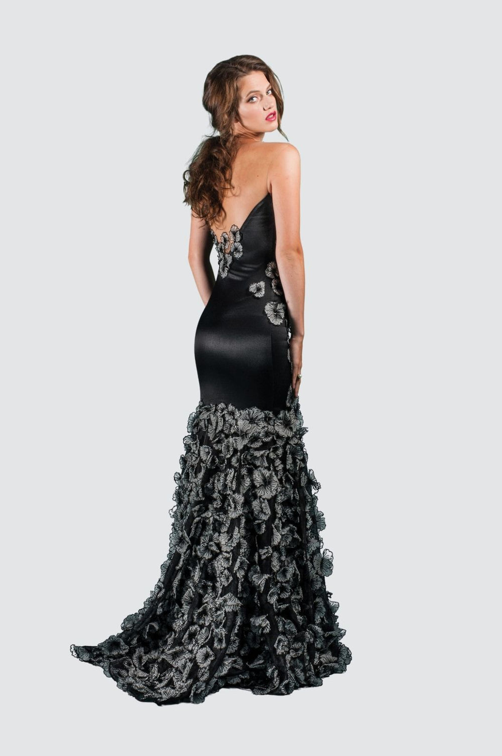 Strapless Black Satin Gown with 3D Embroidered Floral Train