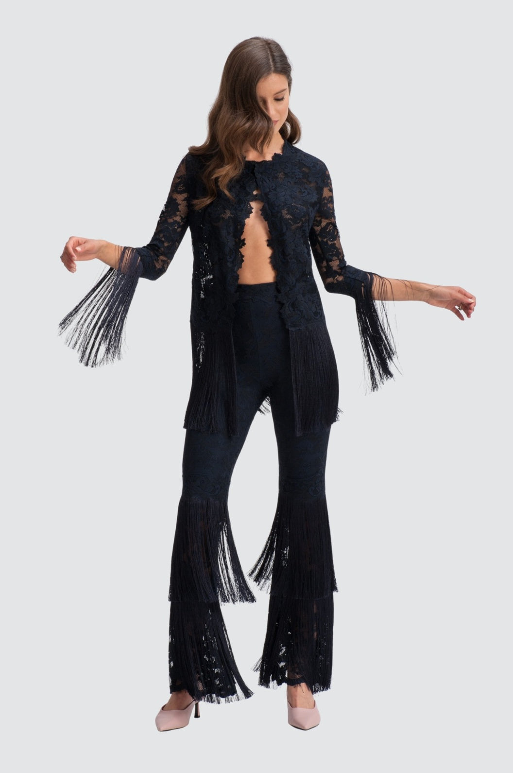 This elegant lace cardigan and trousers set features delicate fringed edges, combining classic sophistication with a modern touch. Crafted to offer a comfortable yet refined fit, the breathable lace fabric ensures ease of movement while maintaining style. Perfect for both casual and semi-formal occasions, this matching set enhances your wardrobe with a unique blend of texture and detail.