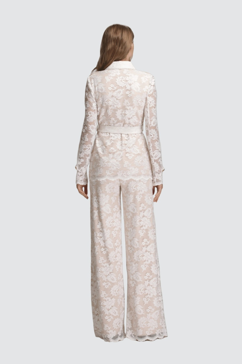 Paired perfectly with the matching high-waisted wide-leg lace trousers, featuring a fluid, palazzo-style cut that elongates the legs and flows beautifully with every step. Scalloped hems add a final touch of romance. Wear the jacket open for relaxed elegance with denim or buttoned and belted with the trousers for a head-to-toe red-carpet-worthy look.