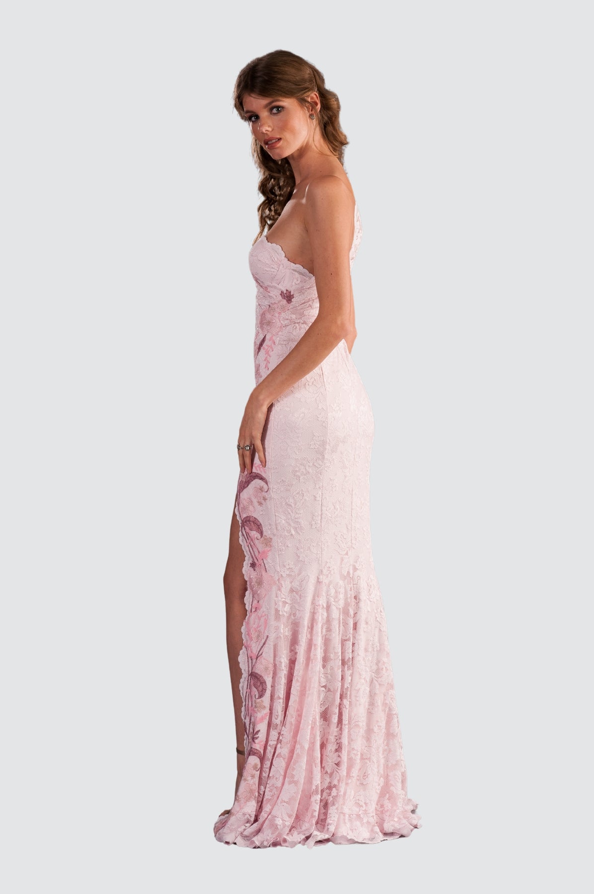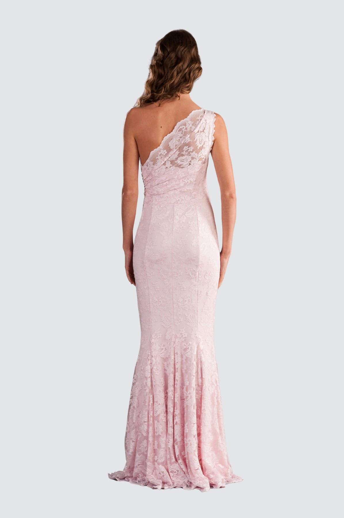 Exquisitely crafted one-shoulder lace gown in soft pink, featuring a sophisticated high slit on the left side. The gown is adorned with delicate cotton candy embroidery applications, creating a refined yet romantic silhouette. Style 4764 combines elegant design elements with premium craftsmanship for a distinctive formal wear option.